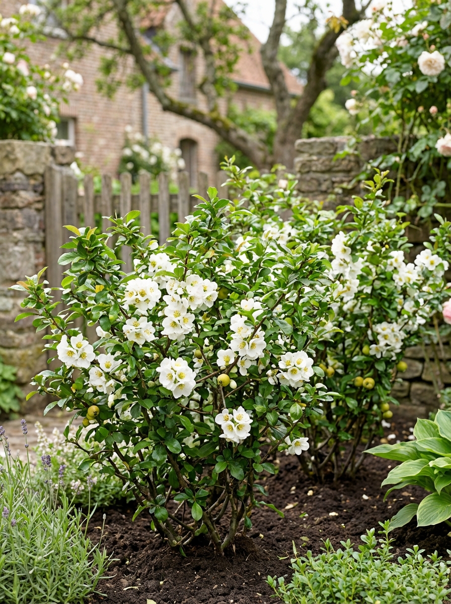 Chaenomeles x superba 'Jet Trail' vormt een stekelige, zeer lage, breed spreidende struik met glanzende donkergroene blaadjes. De bloemen zijn roomwit met goudgele meeldraden. Na de bloei in september - oktober verschijnen de aromatische, gele eetbare vruchten. De vruchten lijken op kleine appeltjes en kunnen gebruikt worden bij bloemschikken maar ook om confituur van te maken.