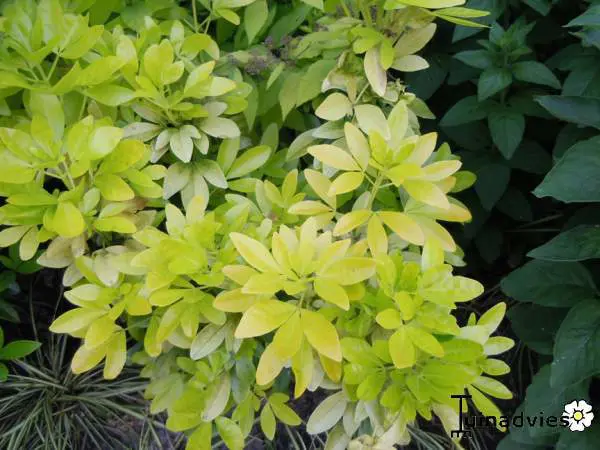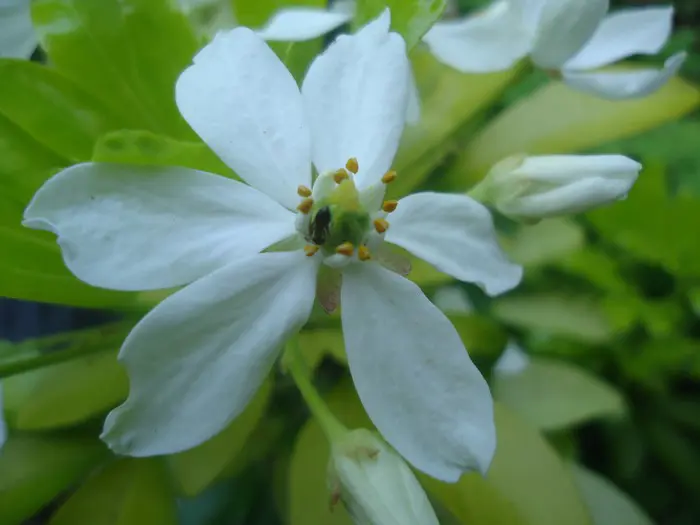 Choisya ternata 'Sundance' is een compacte struik met een ronde groeiwijze en een aromatisch leerachtig blad, goudgeel in het voorjaar tot geelgroen in de zomer.