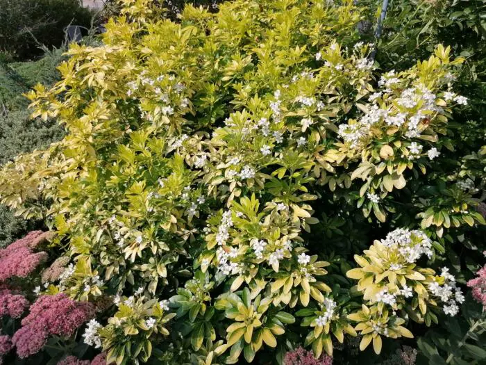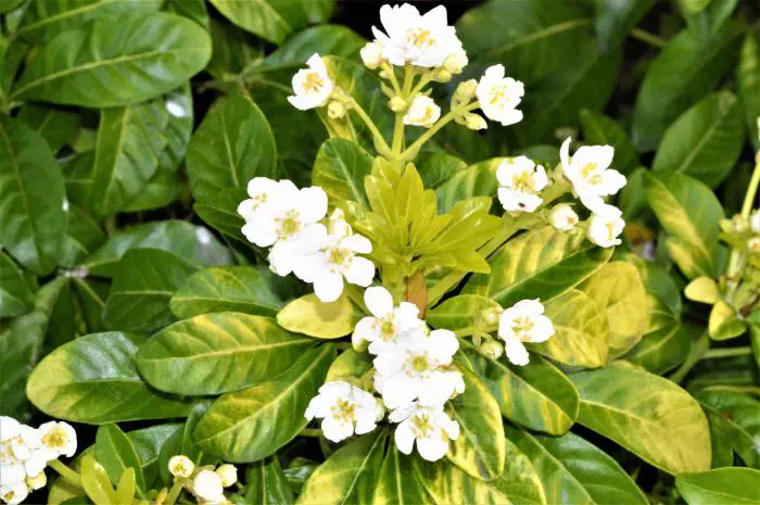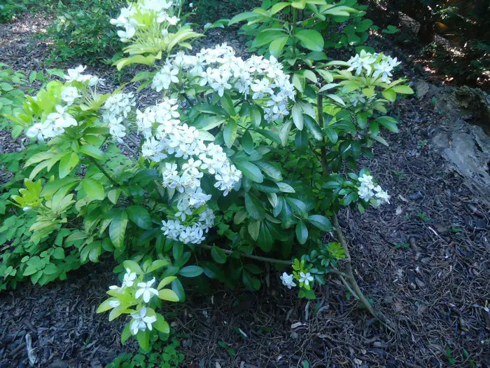 Bloeit met zuiver witte bloemen geurend naar oranjebloesems.