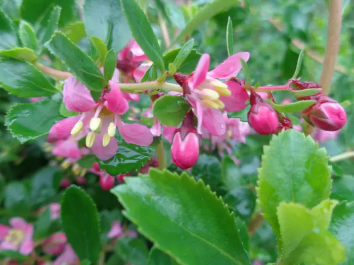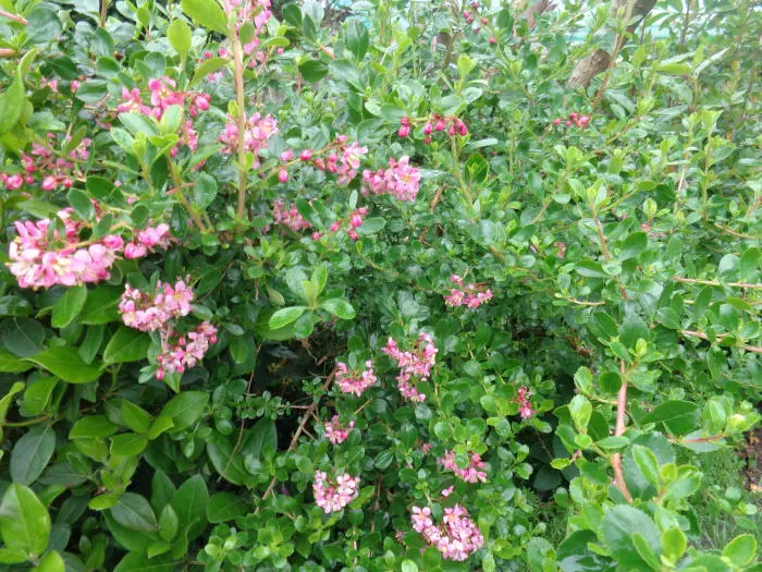 Escallonia 'Dart's Rosyred' is een goed vertakte heester met een brede, overhangende groeiwijze en kleine ovale, glanzende donkergroene bladeren.