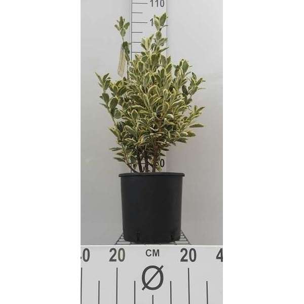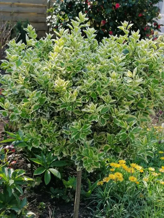 Euonymus japonicus 'Bravo' vormt een opgaande, piramidale struik van glanzende ,lederachtige, grijsgroen bladeren met een lichtgele tot roomwitte rand.