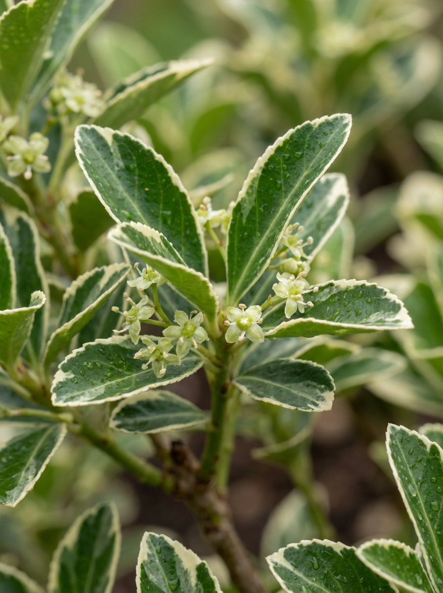 Euonymus japonicus 'Microphyllus Albovariegatus' is een compact laagblijvend struikje met kleine Zilverwit gerande donkergroene blaadjes.Beschut planten tegen koude wind, winterhard tot -7°C.