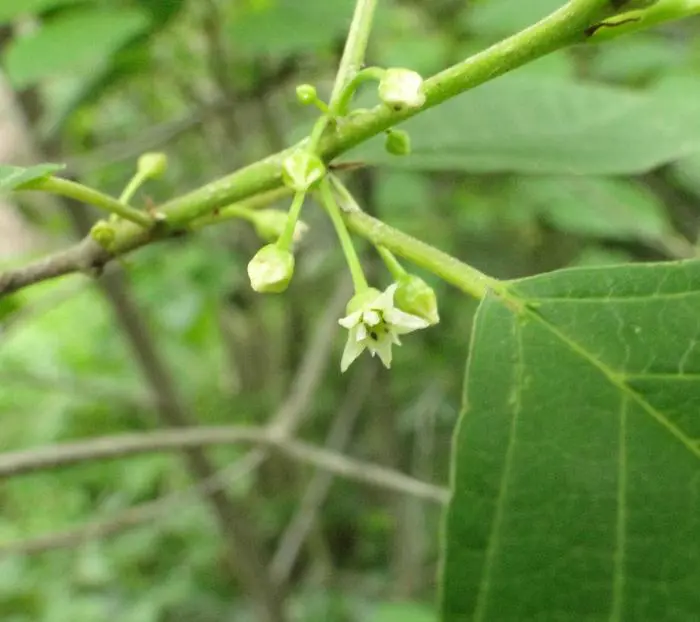 In het late najaar tot de vroege zomer bloeien trosjes van kleine groenwitte bloempjes gevolgd door ronde, vlezige rode bessen die zwart afrijpen. De besjes zijn giftig maar niet voor de vogels.