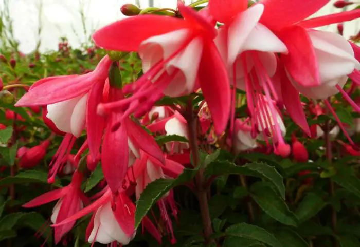 Fuchsia 'Lady Thumb' is een kleine rechtopstaande plant met hangende dubbele bloemen.