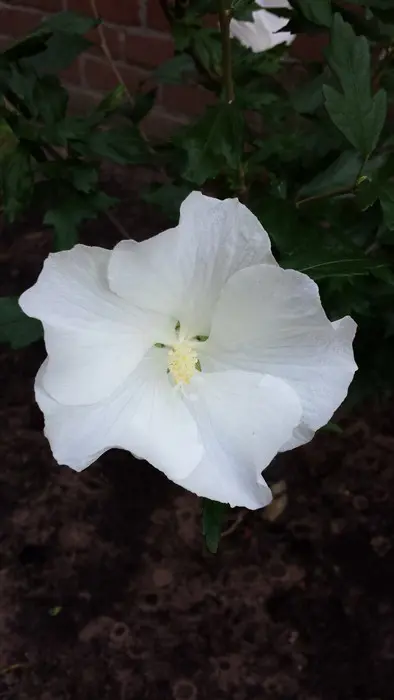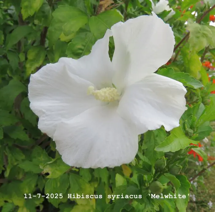 Hibiscus syriacus ‘Melwhite' is een rechtopstaande heester met een compacte groeiwijze en donkergroene bladeren die in het najaar geel verkleuren.