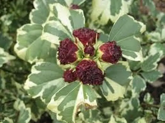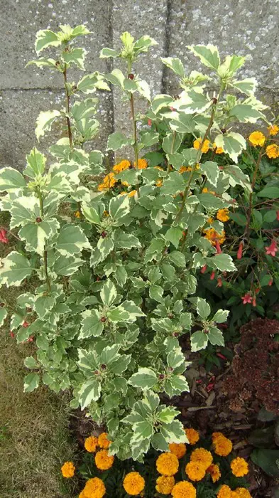 Hibiscus syriacus 'Purpureus Variegatus' is een rechtopstaande brede heester met een compacte groeiwijze en bonte bleekgele/groene bladeren.