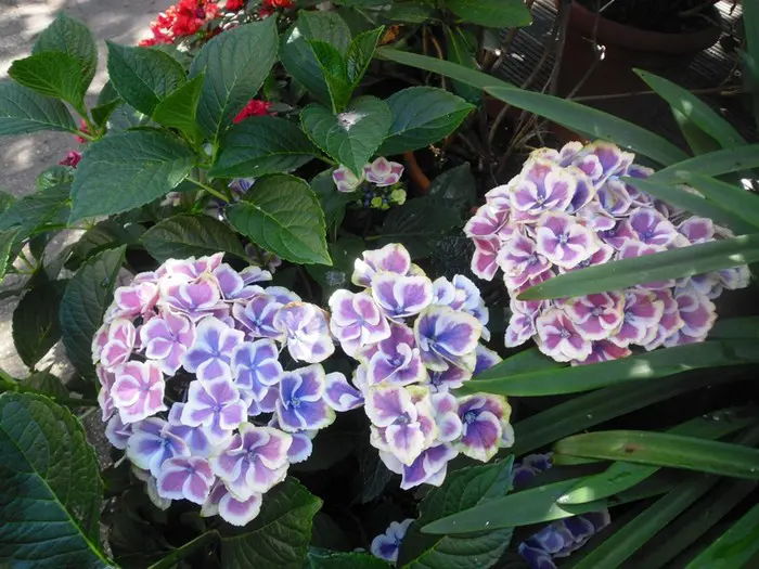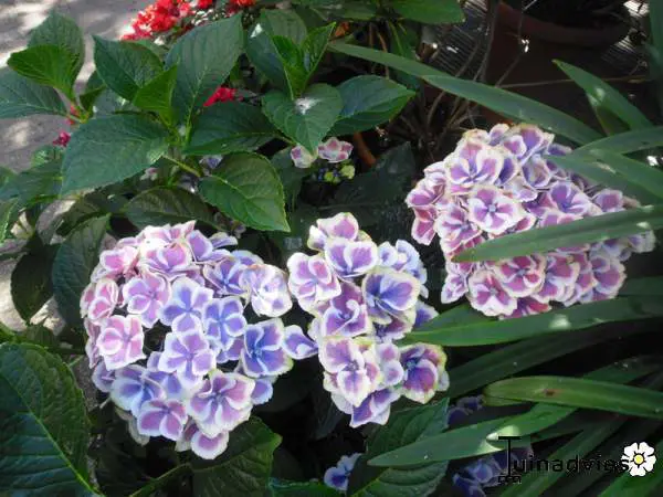 Bolvormige bloemtrossen met dubbelkleurige bloemen die naargelang de zuurtegraad van de grond roze of blauw worden.