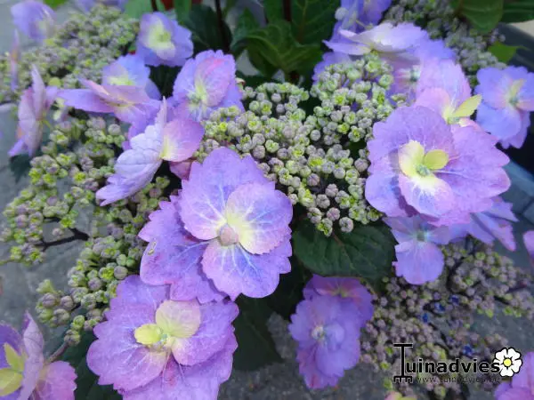 Hydrangea macrophylla 'Blueberry Cheesecake' bloeit paarsblauw, de kleur van heerlijke bosbessen met een geelgroen hartje.