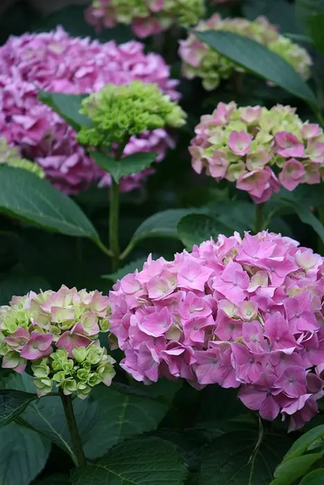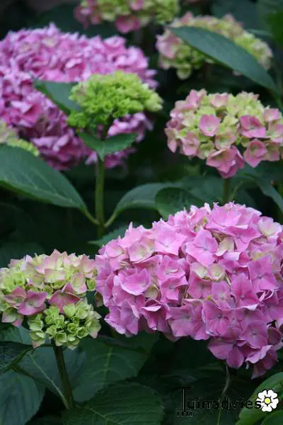 Door behandeling met aluin verkleuren ze blauw, ook in de herfst verkleuren de bloemen donkerder roze of groener .