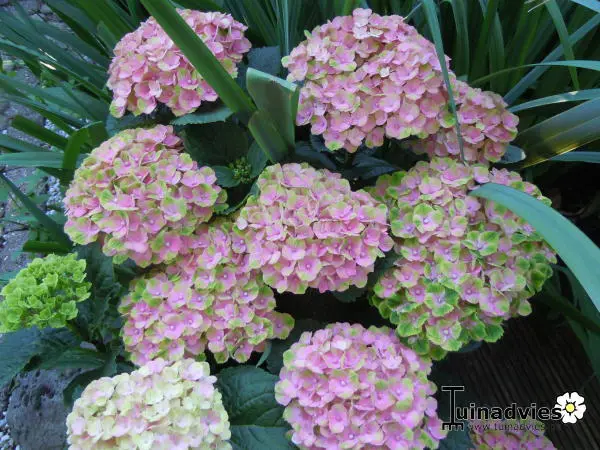 Deze cultivar heeft tot de herfst afwisselende kleurschakeringen. De bloemen bloeien eerst groen en wit, kleuren dan roze. In de herfst zijn de bloemen dan meer groen/roze gespikkeld.