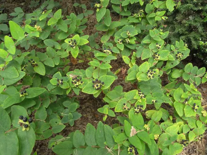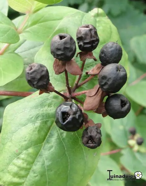 Hypericum x androsaemum is een bossige struik met smal eivormige, groene bladeren met een bleker onderkant.