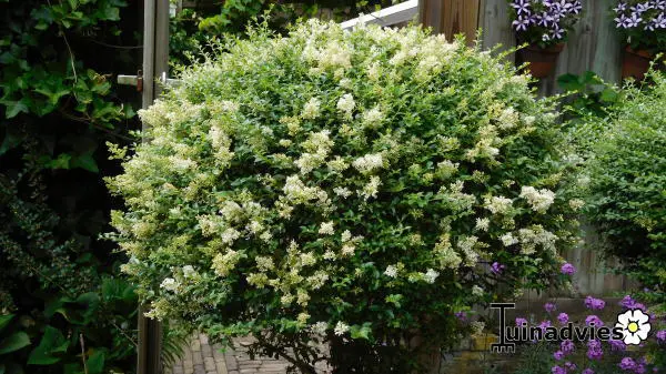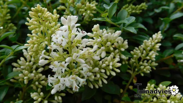 Bloeien met geurige opstaande cremewitte bloemtrosjes in juni/juli.