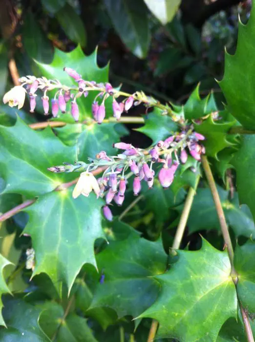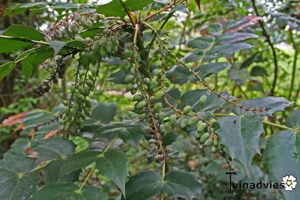 Mahonia bealei heeft geel/wit gevlekt blad.