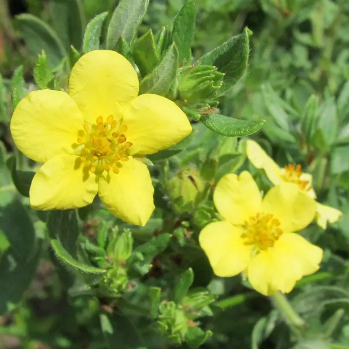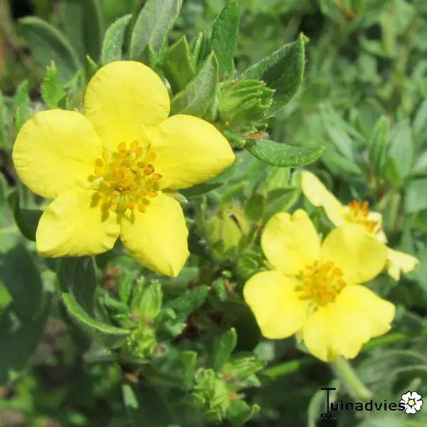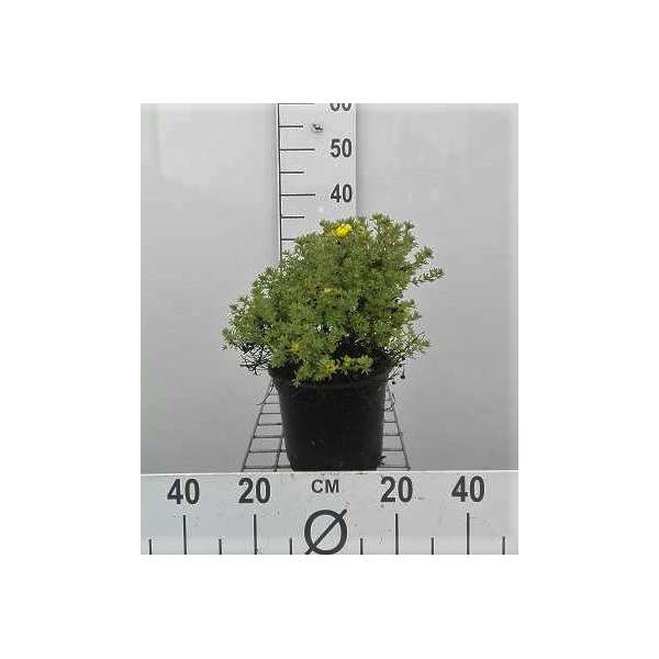Potentilla fruticosa 'Kobold' is een zeer dichte variëteit met een rijke bloei van komvormige goudgele bloemen die enigszins verbleken in de felle zon.