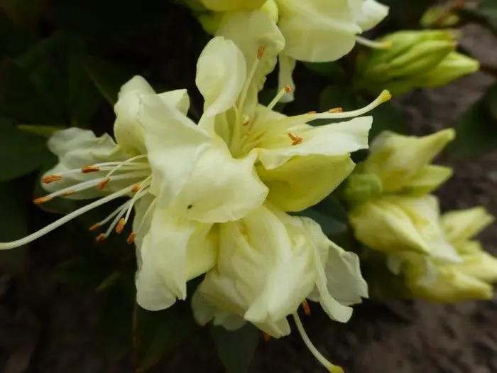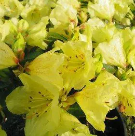 Rhododendron 'Curlew' is een laagblijvend struikje met rijkbloeiende ronde zachtgele bloemtrossen.
