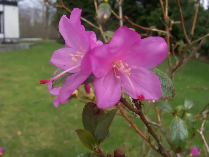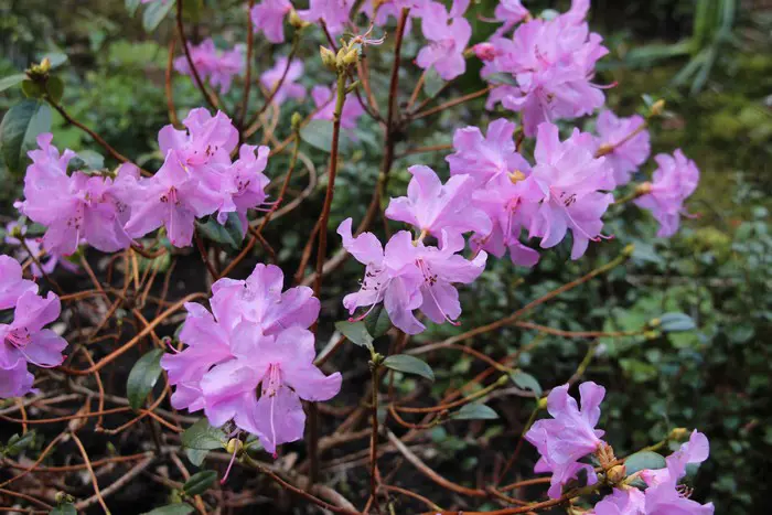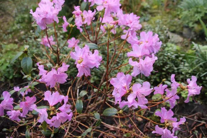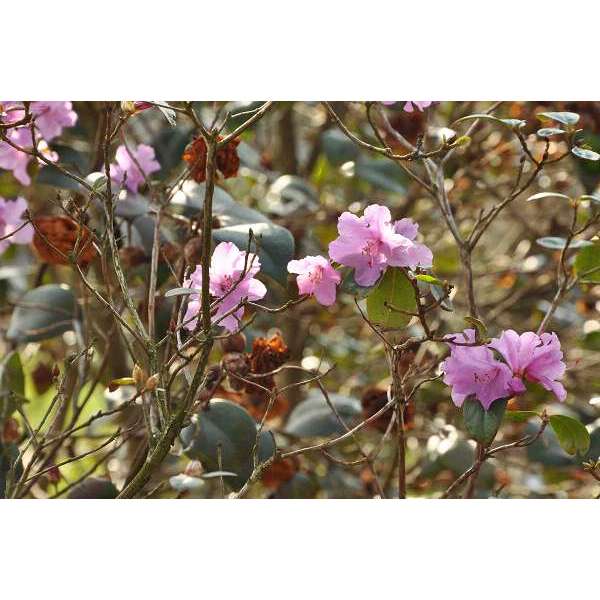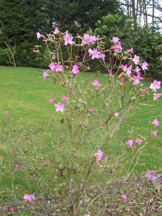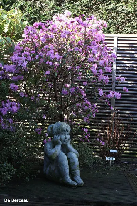 Rhododendron 'Praecox' heeft glanzend donkergroen blad en bloeit lilapaars.