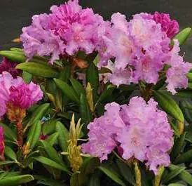 Rhododendron 'Caroline Allbrook' bloeit met ronde trossen van trechtervormige bloemen met gegolfde bloemranden.
