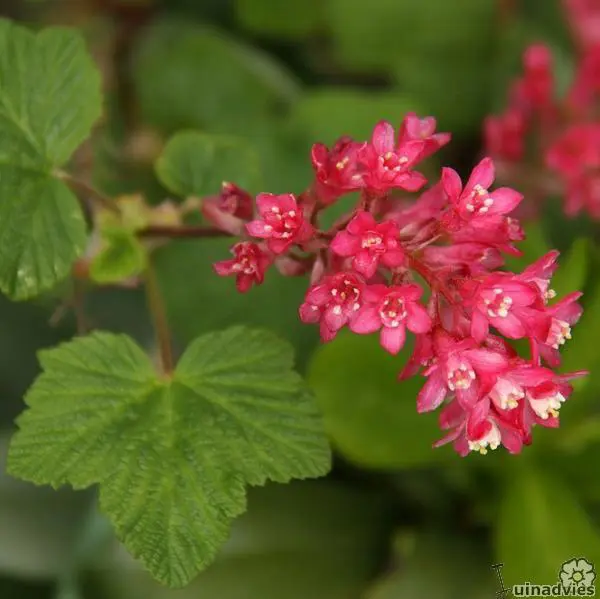 Ribes sanguineum is een bossige rijkbloeiende struik met vroeg in het voorjaar bloeiende donker karmijnrood/roze gevolgd door blauwzwarte vruchten. De bloemtrossen zijn 8 cm lang en geuren niet erg aangenaam, buiten is de geur niet storend maar wel binnen als je een paar takken in een vaas zet.