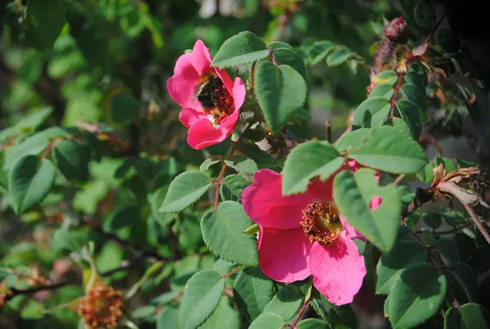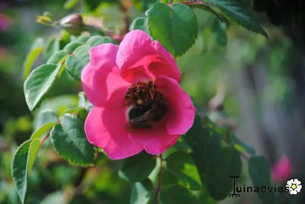 De roos vormt een bossige struik met mat groen blad en enorm veel doornen.