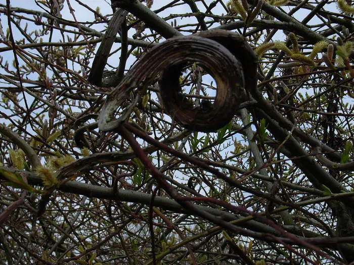 Het is een struik die ook hier in het wild te vinden is, vormt glanzende bruinrode, bandvormige en gedraaide takken. Deze worden door hun sierlijkheid veel gebruikt in het bloemschikken.