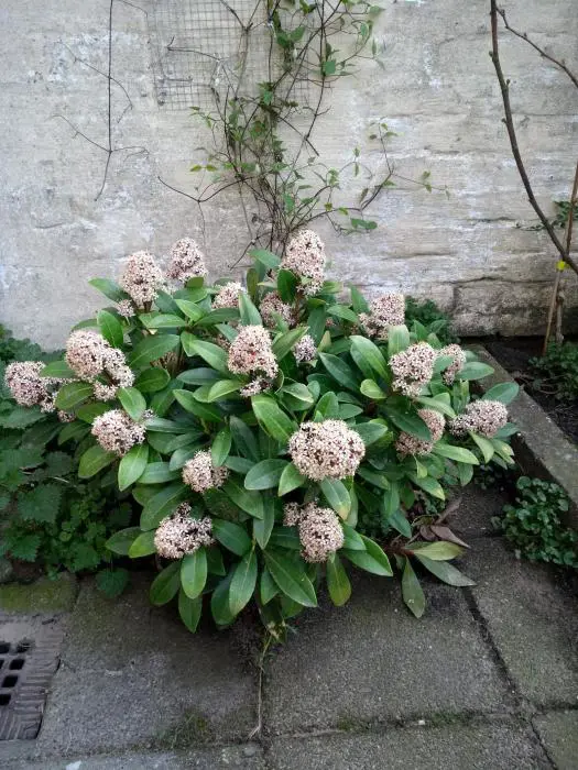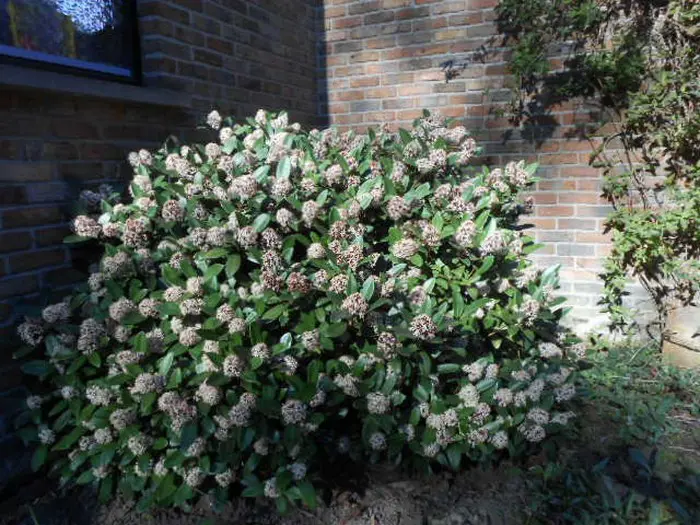 Skimmia japonica 'Rubella' is ook in de winter een decoratief groenblijvend plantje met een compacte, bolvormige groeiwijze, glanzend grijsgroene ovale blaadjes en vanaf oktober met witte naar rood verkleurende bloemknopjes. In de lente bloeien ze met zeer geurige roomwitte bloempjes.