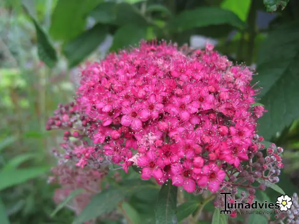 Spiraea japonica 'Country Red' is een stevige, compacte struik met langwerpige groene bladeren die in het najaar tot geeloranje verkleuren.