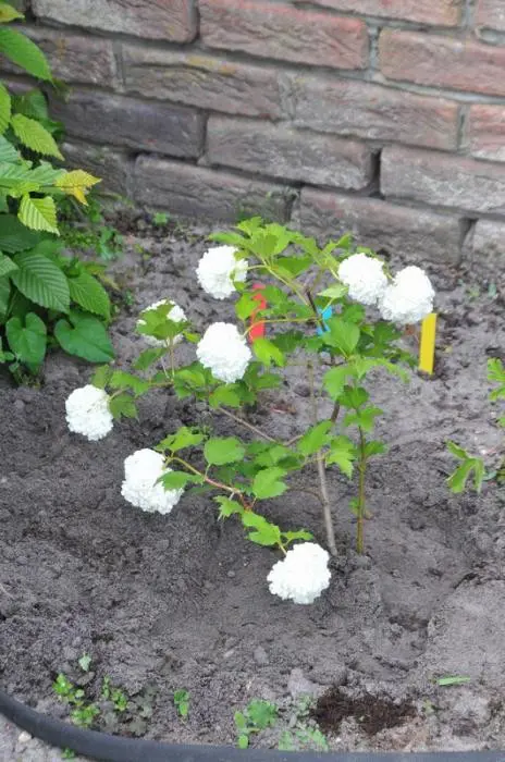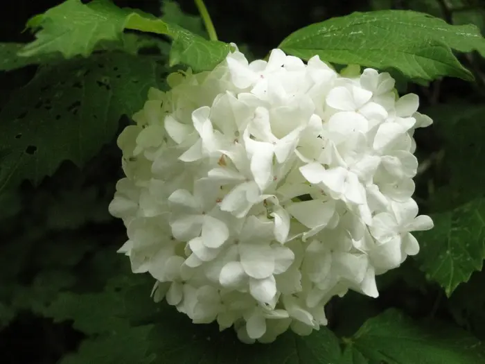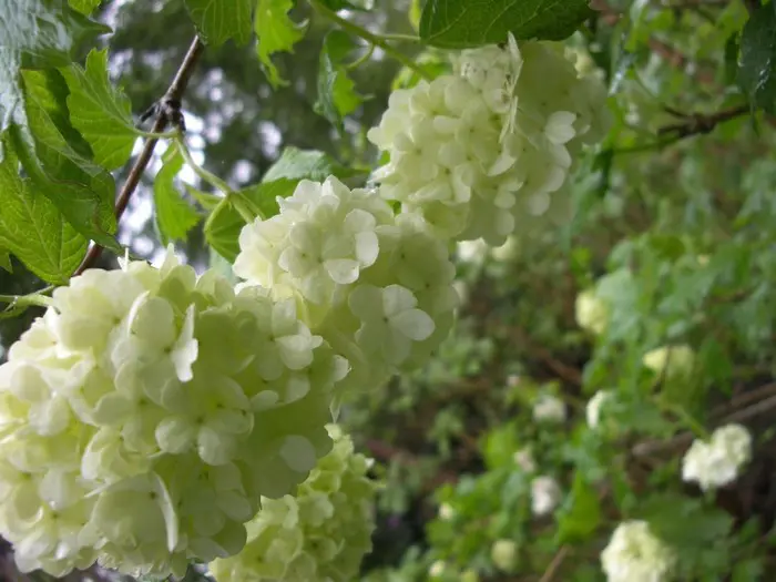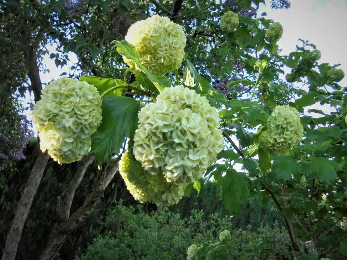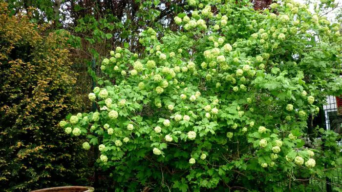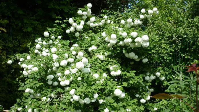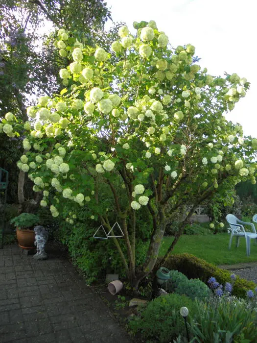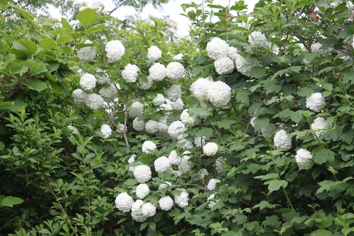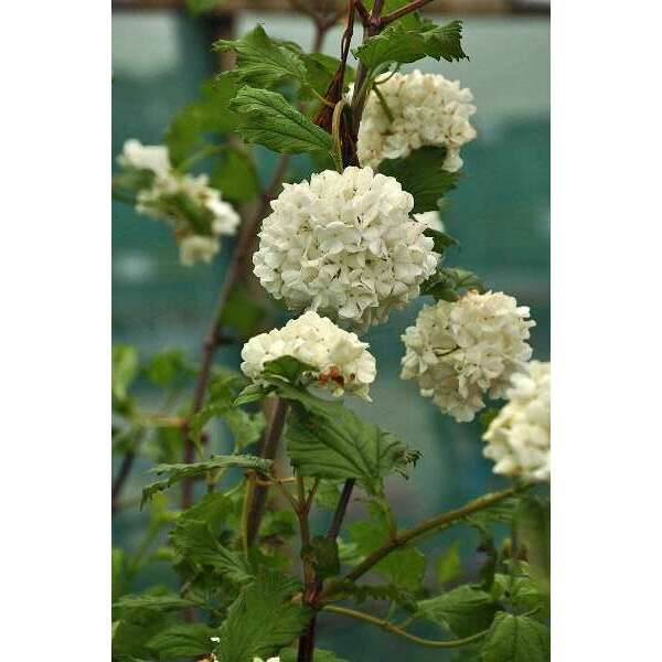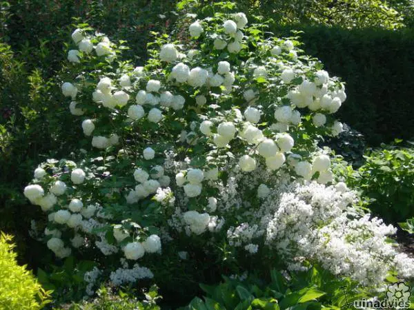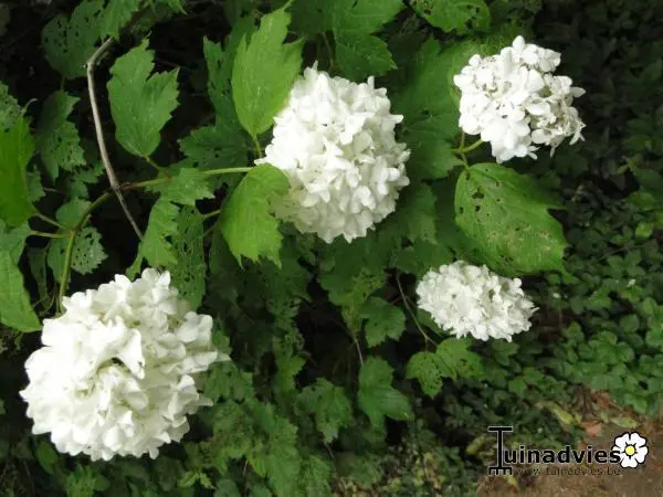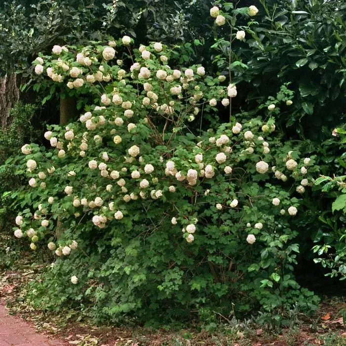 Viburnum opulus 'Roseum' is een grote bloeirijke struik met een bossige en ronde vorm, overladen van witte bolvormige bloemen die soms een roze tint krijgen.