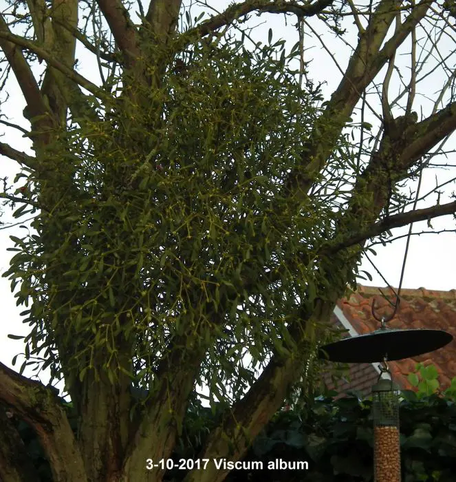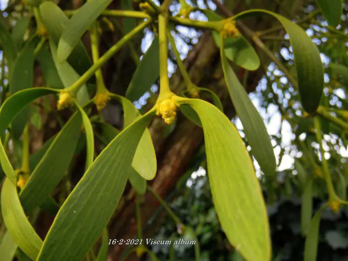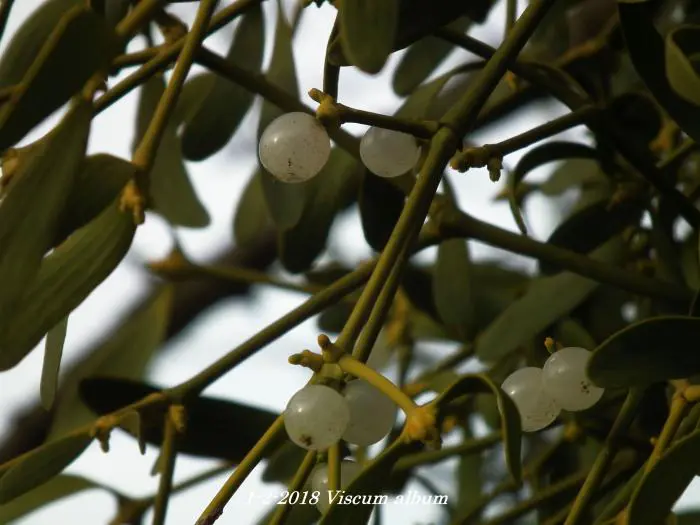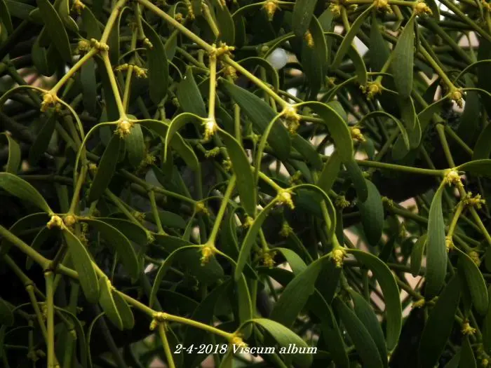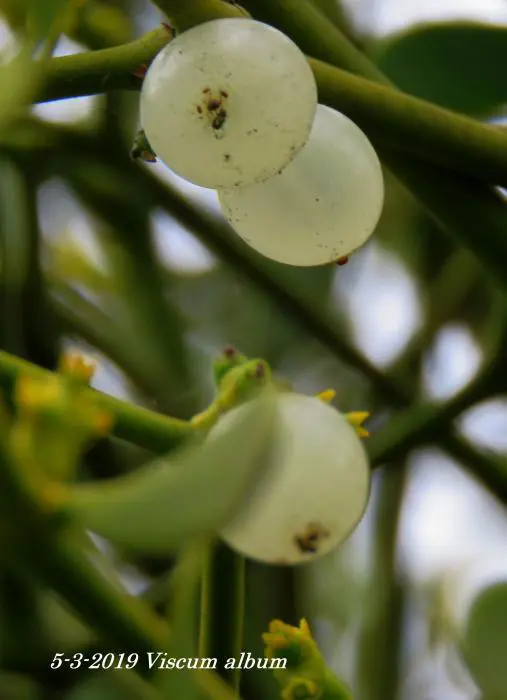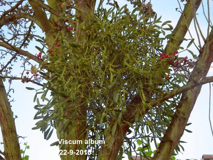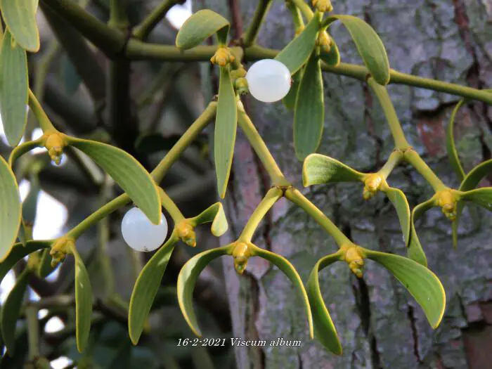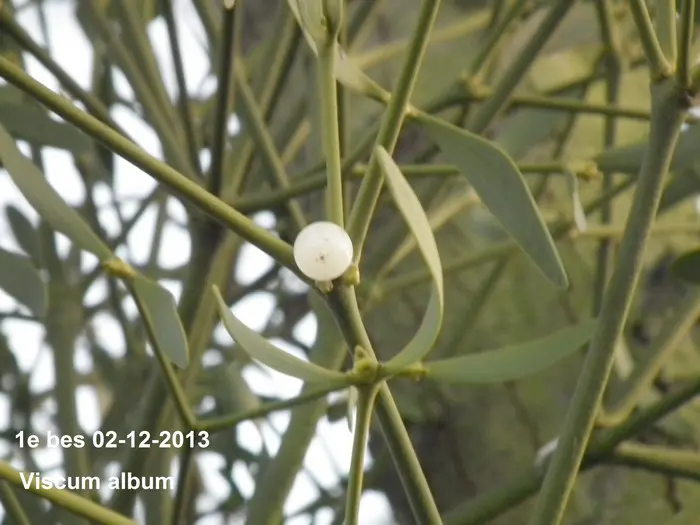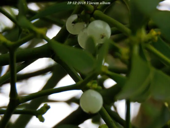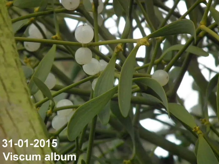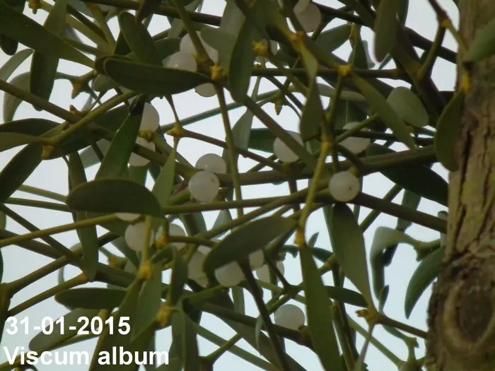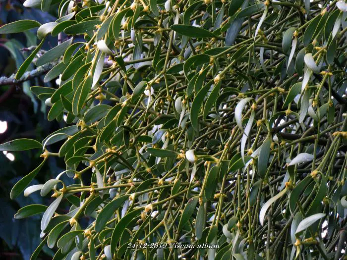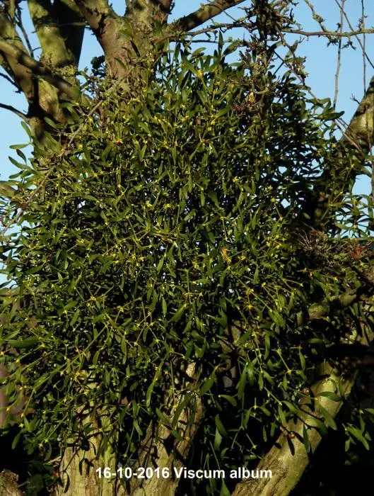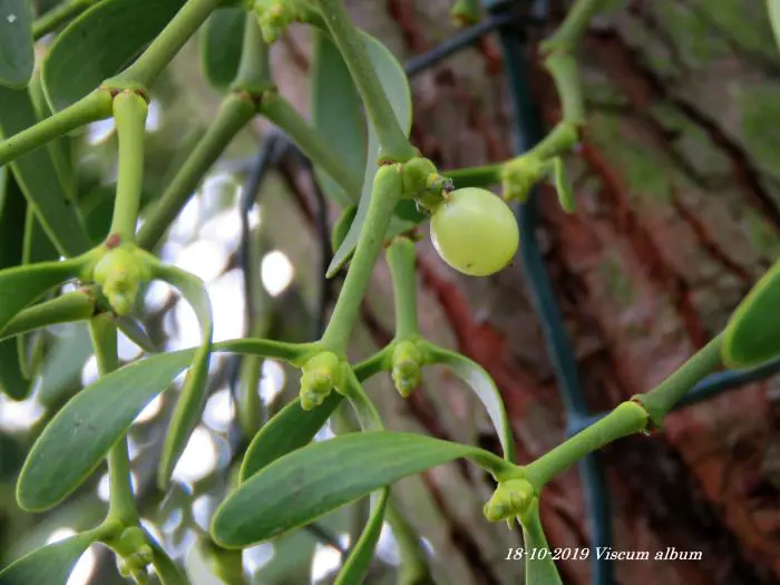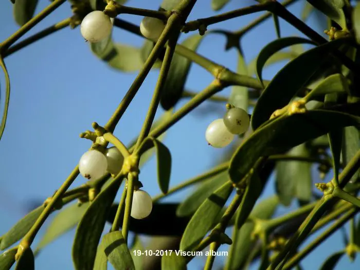 Viscum album is beter bekend als maretak die als dikke bollen in de bomen hangen. Ze worden ook veel gebruikt met Kerstmis in bloemstukken of om boven een deur te hangen.