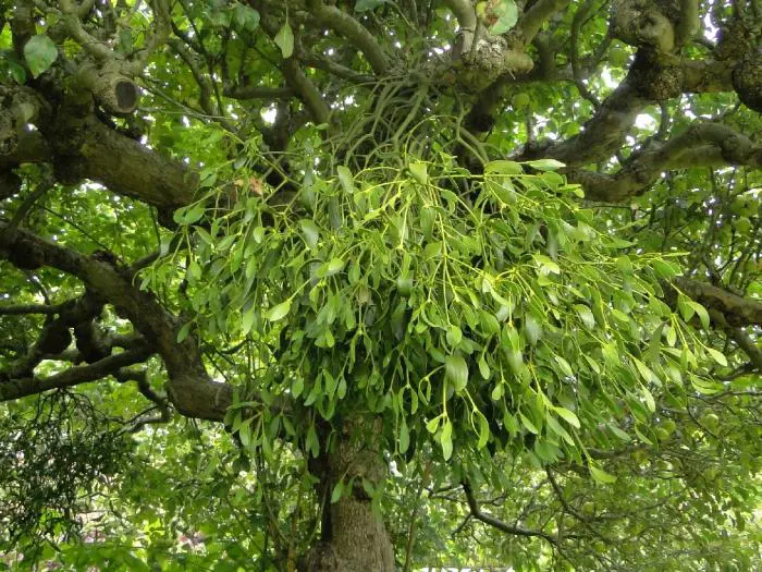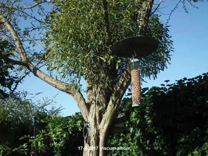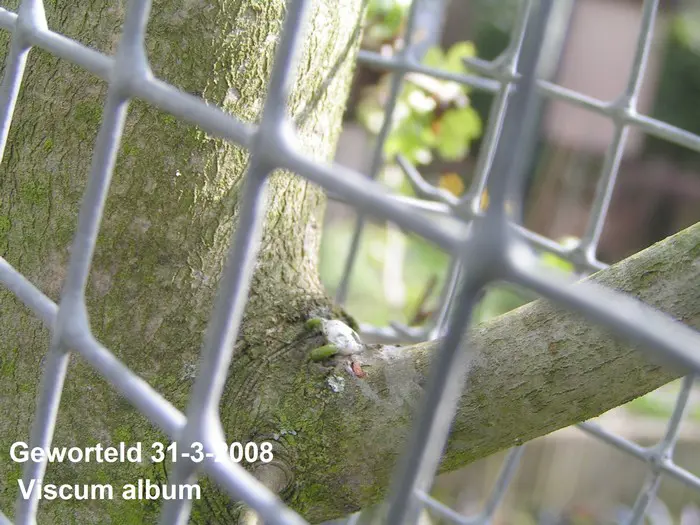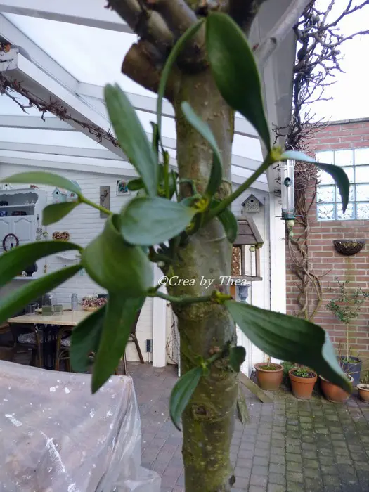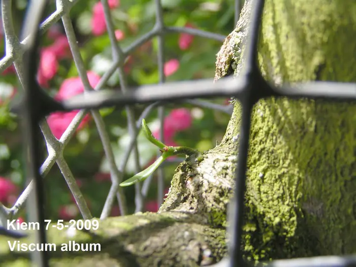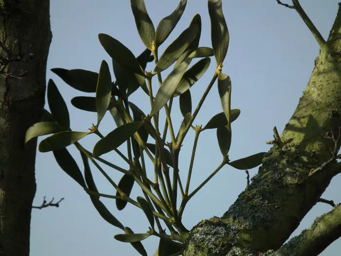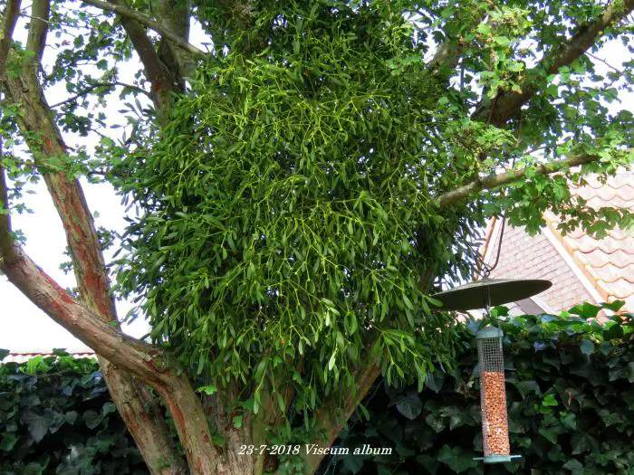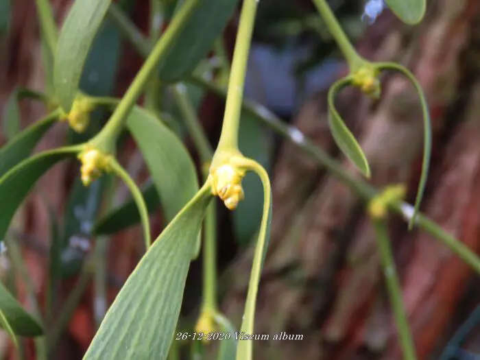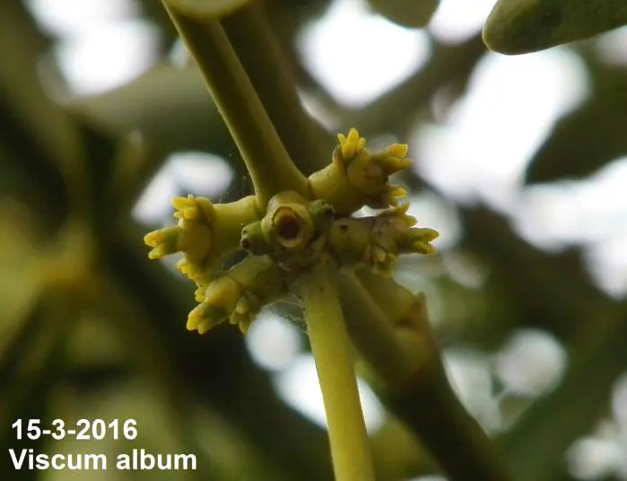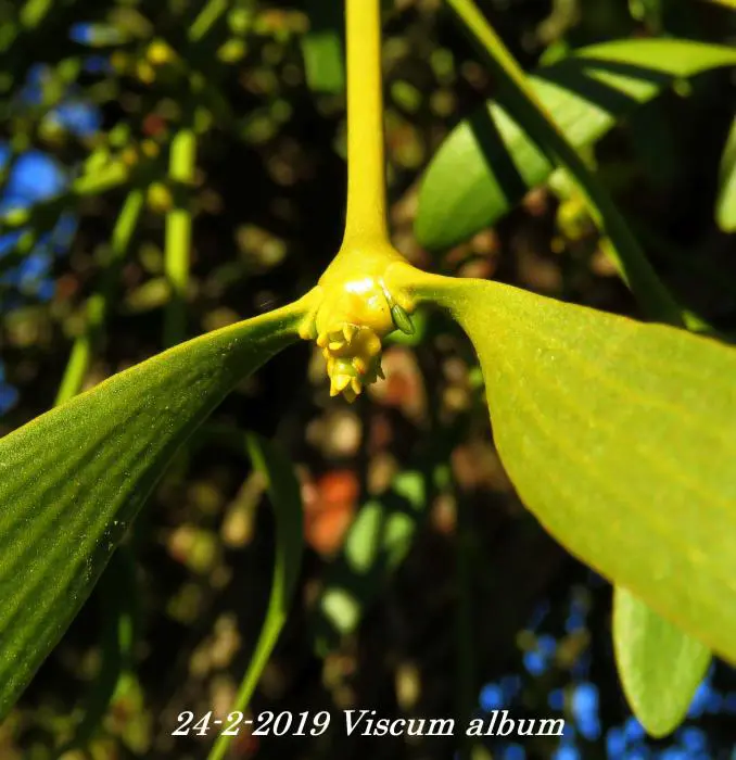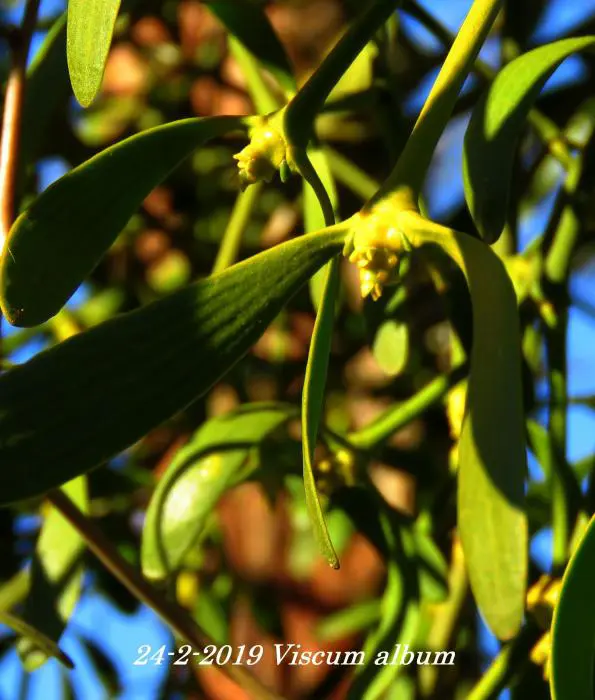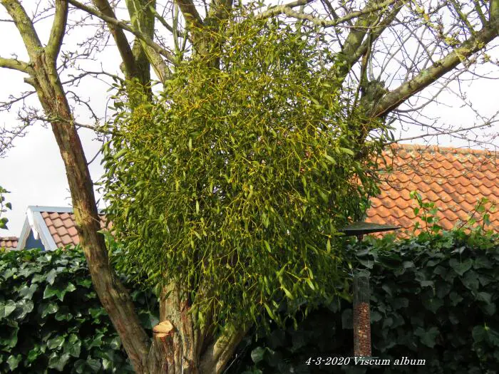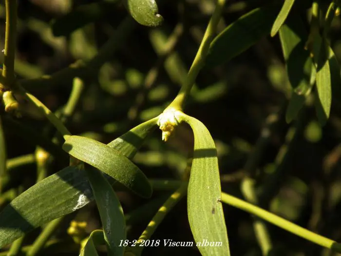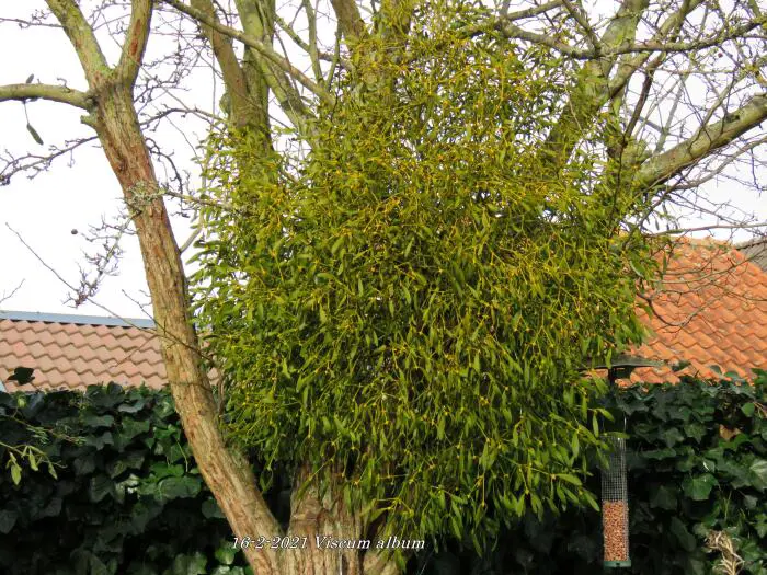 Viscum album is beter bekend als maretak die als dikke bollen in de bomen hangen. Ze worden ook veel gebruikt met Kerstmis in bloemstukken of om boven een deur te hangen.