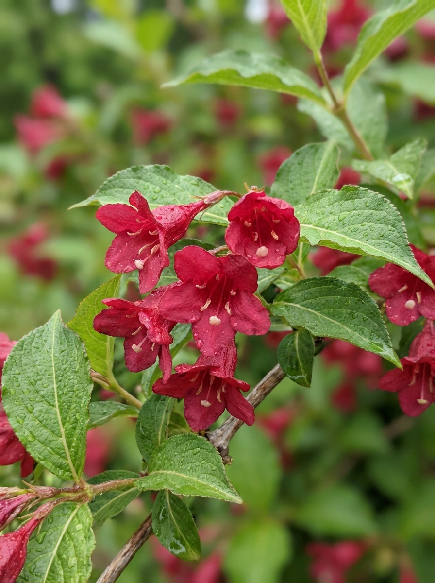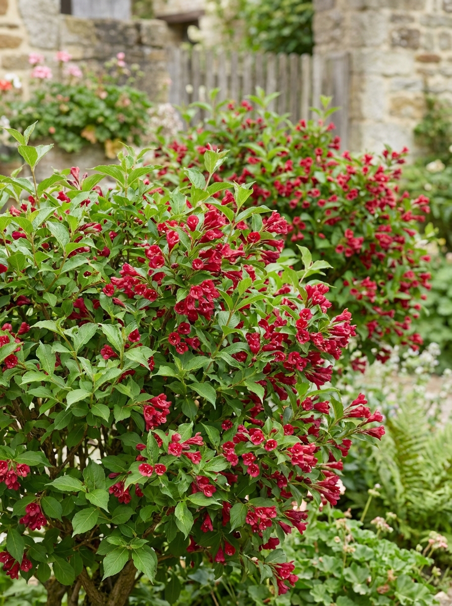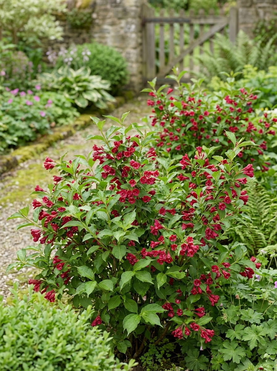 Weigela florida 'Red Prince' is een meer gedrongen variëteit met een breed opgaande groeiwijze en trompetvormige scharlakenrode bloemen. Geven in de nazomer nog een rijkelijke nabloei.