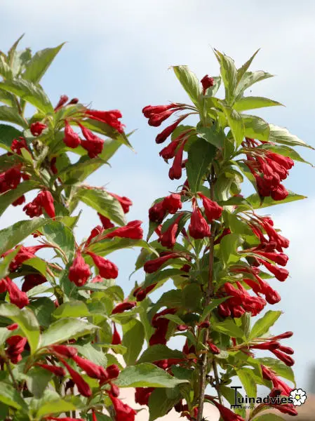 Weigela florida 'Red Prince' is een meer gedrongen variëteit met een breed opgaande groeiwijze en trompetvormige scharlakenrode bloemen. Geven in de nazomer nog een rijkelijke nabloei.