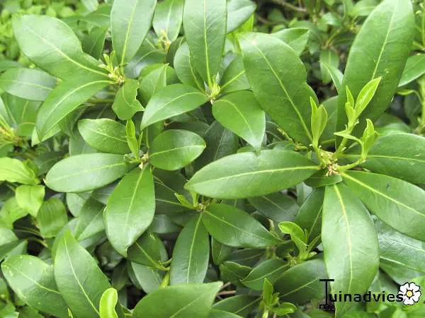 Skimmia japonica 'Kew White' is ook in de winter een decoratieve groenblijvende struik met een compacte, bolvormige groeiwijze, glanzend grijsgroene ovale blaadjes en vanaf oktober met witte naar rood verkleurende bloemknopjes. In de lente bloeien ze met zeer geurige roomwitte bloempjes.