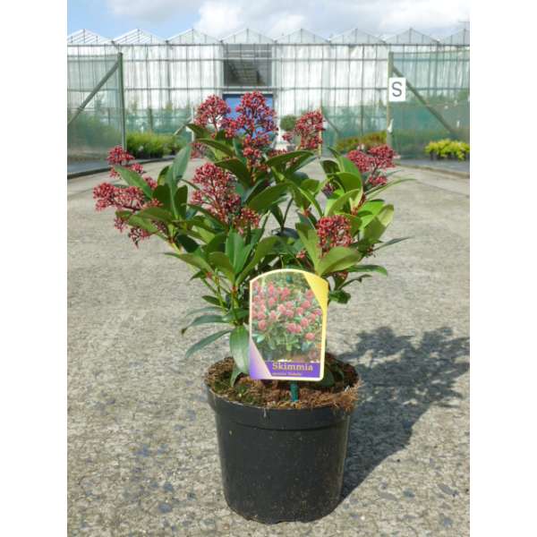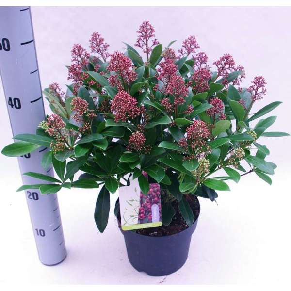 Skimmia japonica 'Rubella' is ook in de winter een decoratief groenblijvend plantje met een compacte, bolvormige groeiwijze, glanzend grijsgroene ovale blaadjes en vanaf oktober met witte naar rood verkleurende bloemknopjes. In de lente bloeien ze met zeer geurige roomwitte bloempjes.