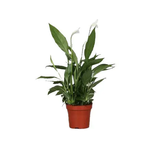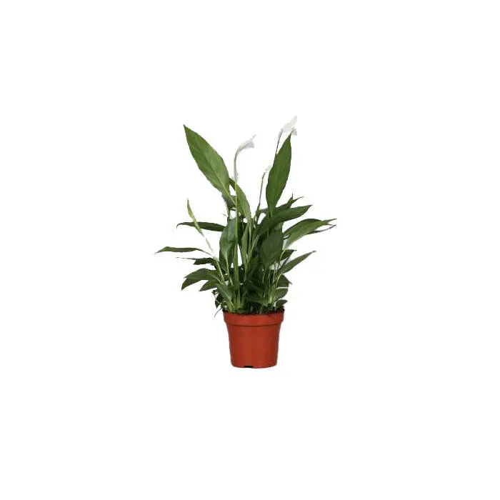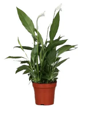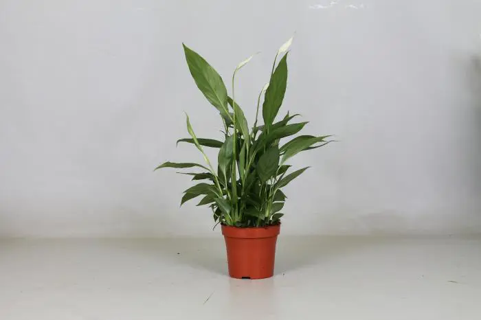 De bloeikolf van Spathiphyllum wordt door een witte bloeischede omschulpt. De lang gesteelde bloemhoofden torenen boven de talrijke, ranke bladeren uit.