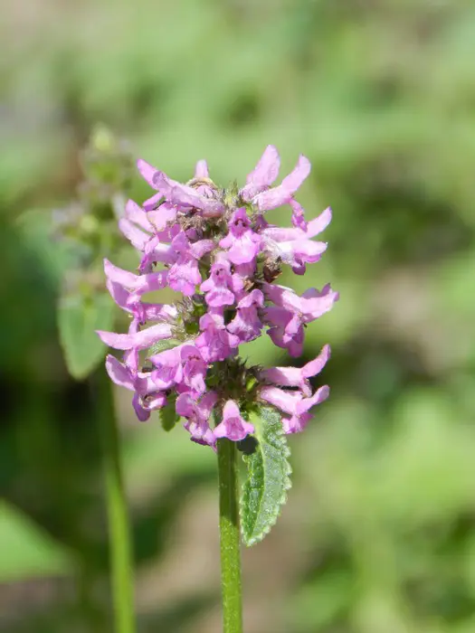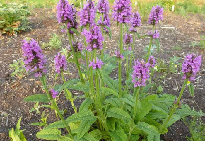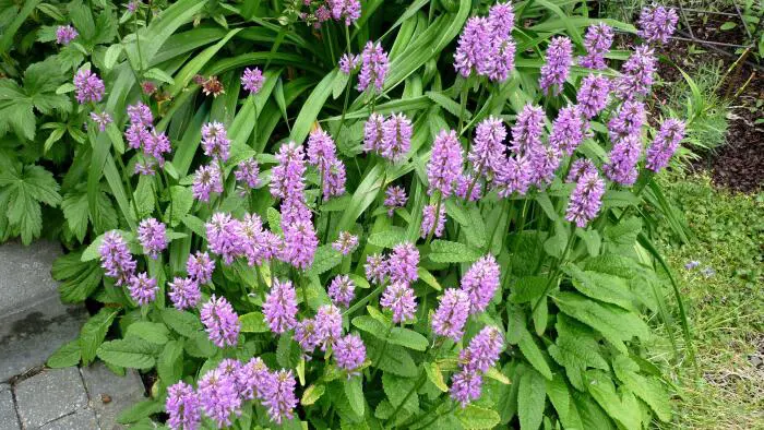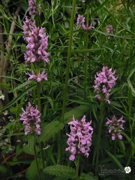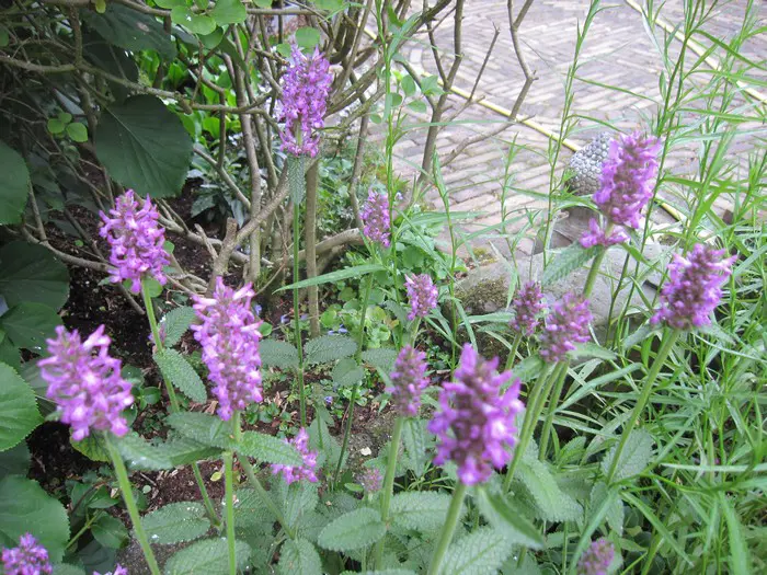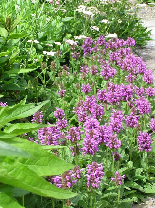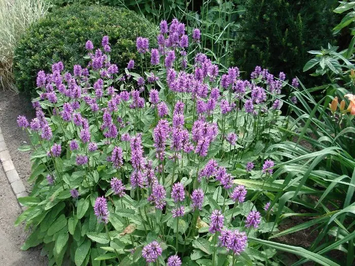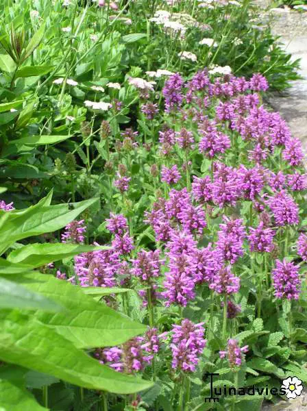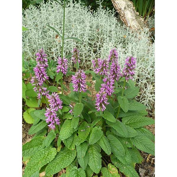Stachys monieri 'Hummelo' vormt een ronde pol van groene gestructureerde bladeren en bloeit met mooie aren van fel violetpaarse bloemen.