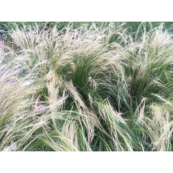 Stipa tenuissima is een polvomende siergras met smalle lineaire bladeren en zilvergroene zijdeachtige bloempluimen.