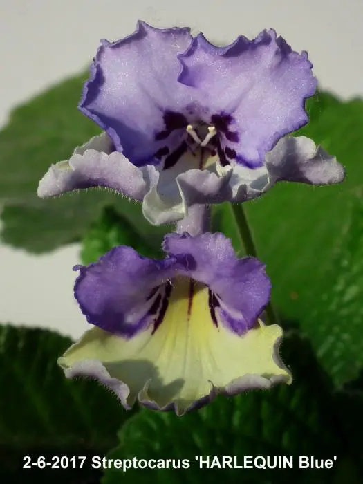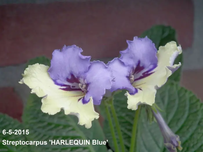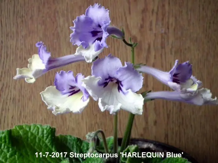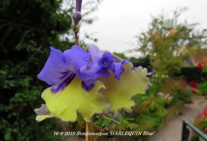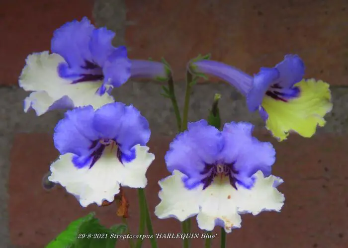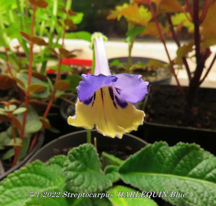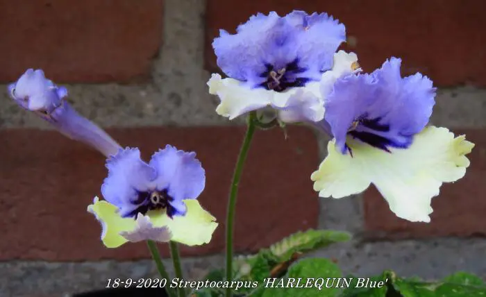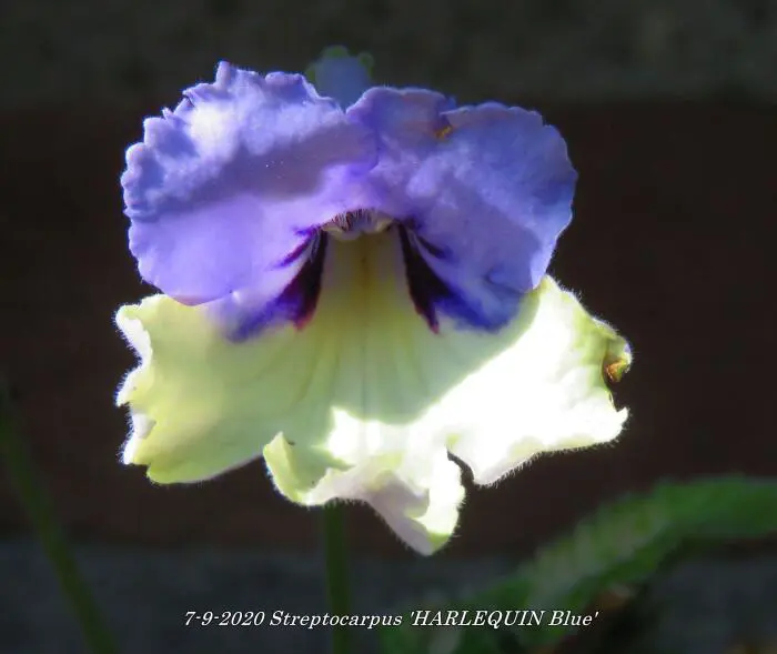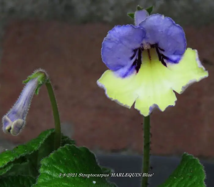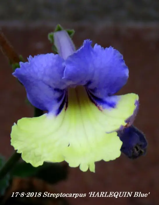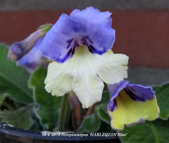 Streptocarpus 'Harlequin Blue' bloeit blauw met geel.