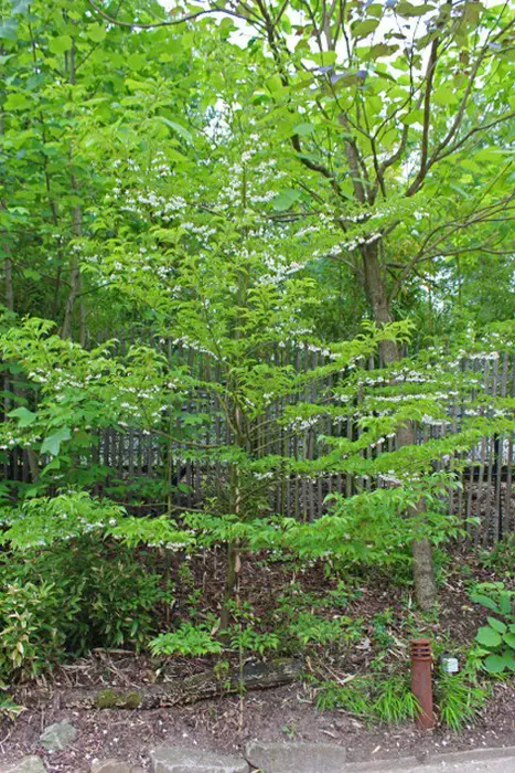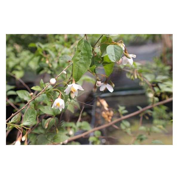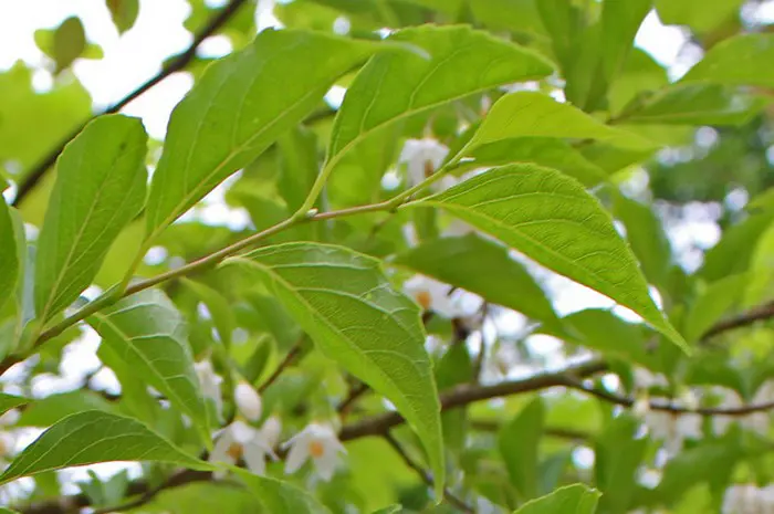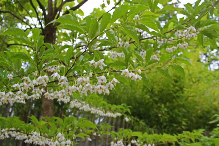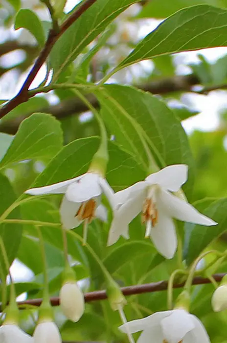 Styrax japonicus heeft lichtgroene bladeren en bloeit met hangende trosjes van geurende witte bloemen.
