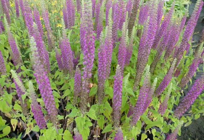 Bloeit met lange, slanke aren van violetpaarse bloemen die boven het gebladerte uitsteken.
