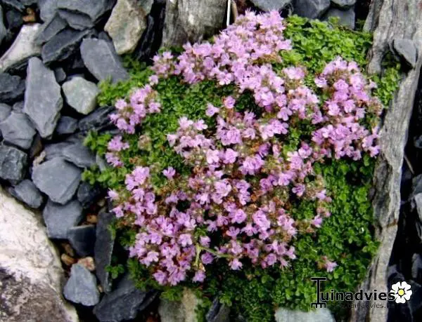Tijm is niet alleen een veel gebruikt kruid in de keuken, maar sommige variëteiten lenen zich eveneens als goede bodembedekker (kruiptijm) voor een zandige, kalkhoudende grond.