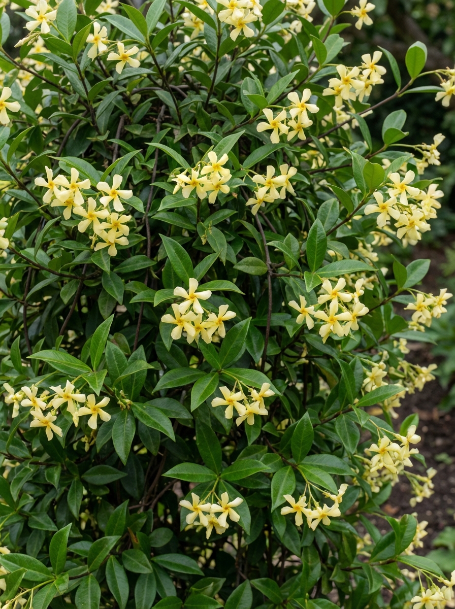 Trachelospermum jasminoides 'Star of Toscane' groeit veel compacter dan de soort met een langere bloei van kleine roomgele stervormige, heerlijk geurende bloemen.