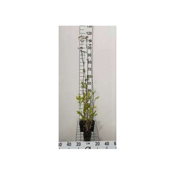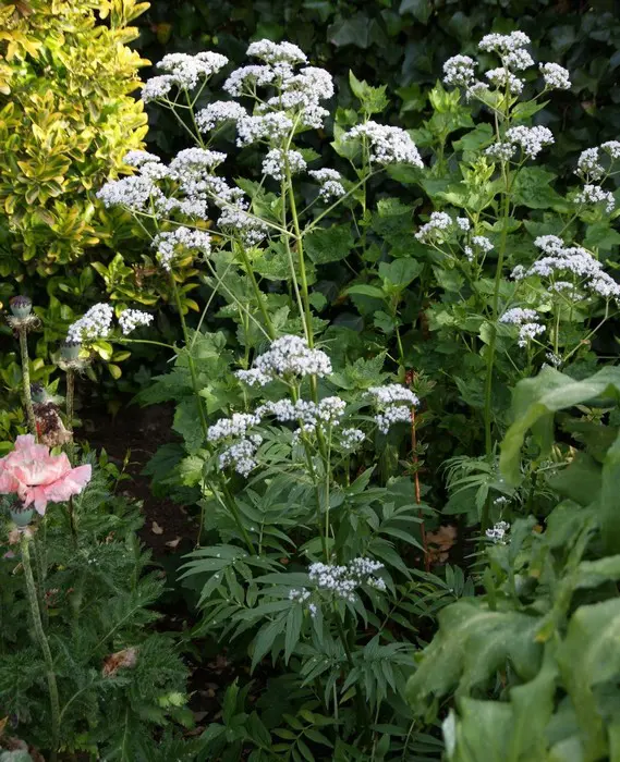 Dit is een kruidachtige plant waarvan de bloemen in schermen op lange stelen bloeit met zachtroze bloempjes.