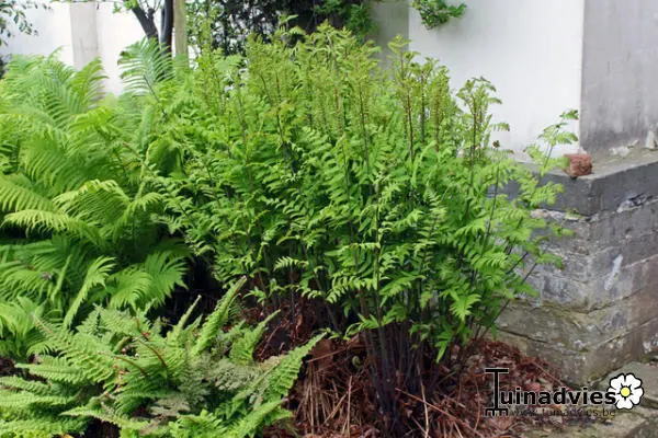 Pracht van een varen met grote violetrode dubbelgeveerde bladeren.