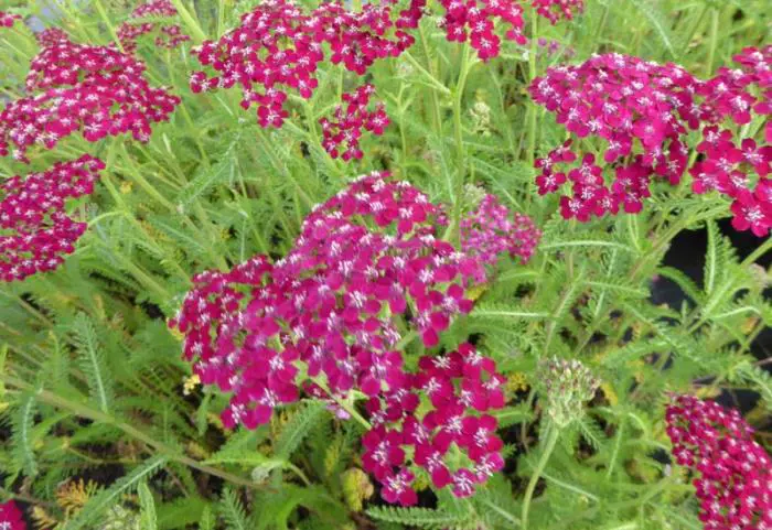 Het is een sterke groeier met prachtig donkergroen geveerd, aromatisch blad en bloeit met afgeplatte schermvormige tuilen van magentarode tot framboosrode bloemen.