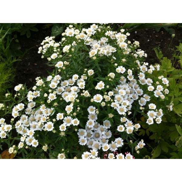 Achillea ptarmica 'Nana Compacta' is een prachtige dwergvariëteit met tuilen van kleine enkele of halfdubbele, zuiverwitte pompons met een zilveren hart.