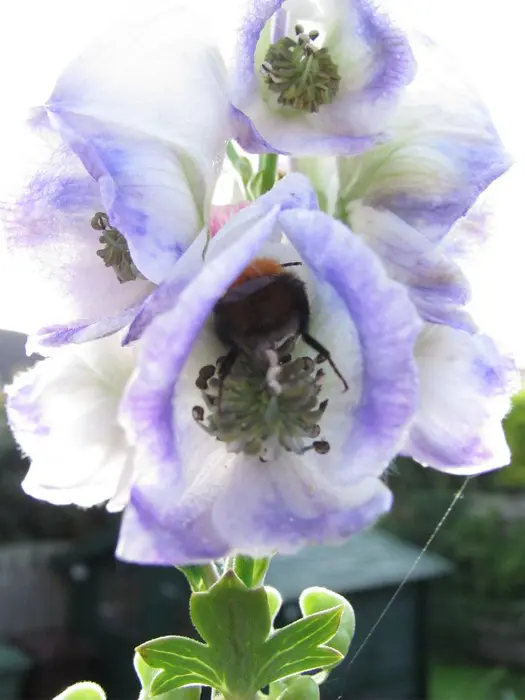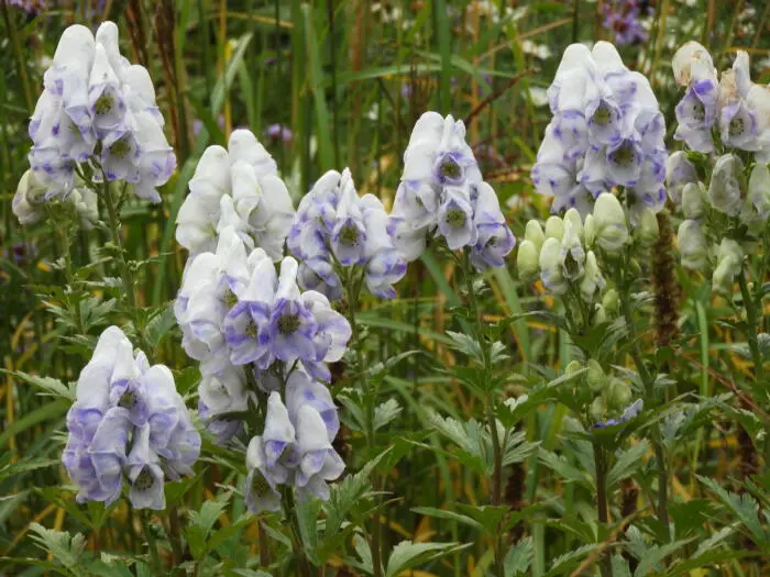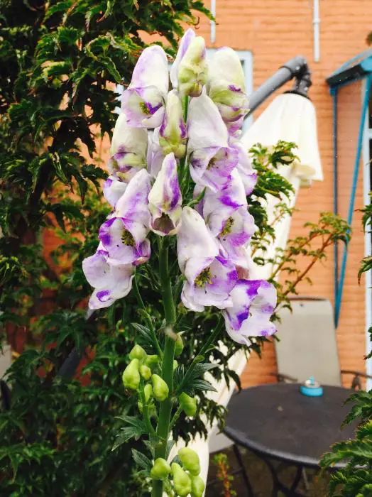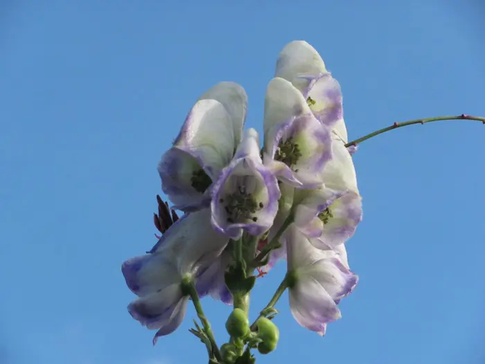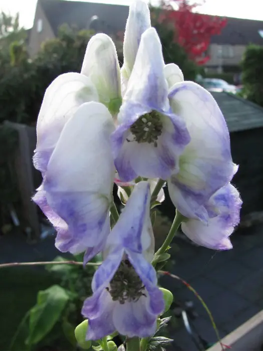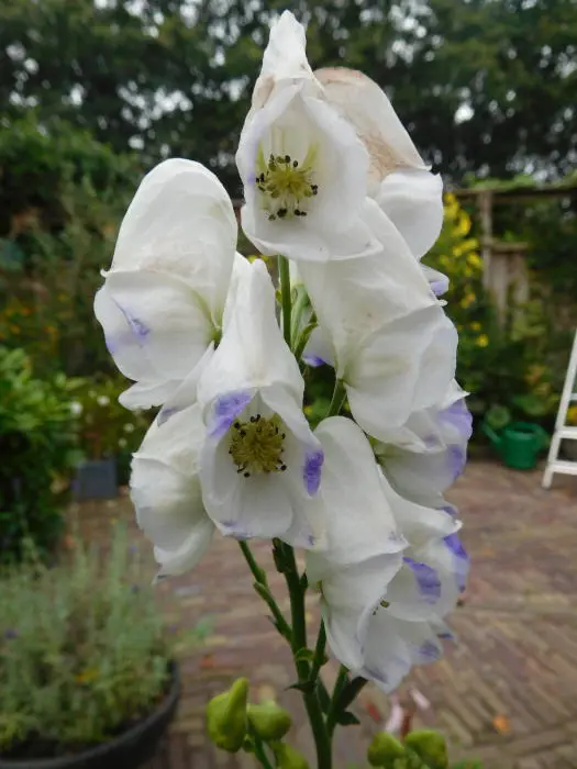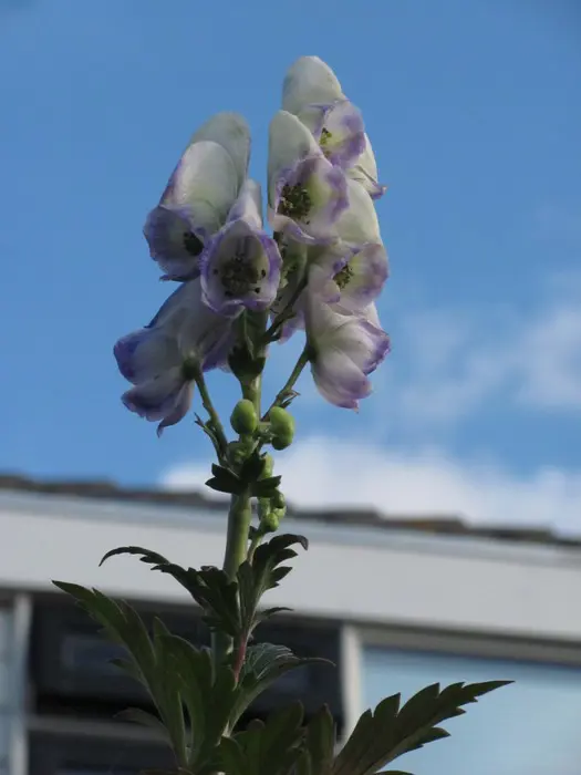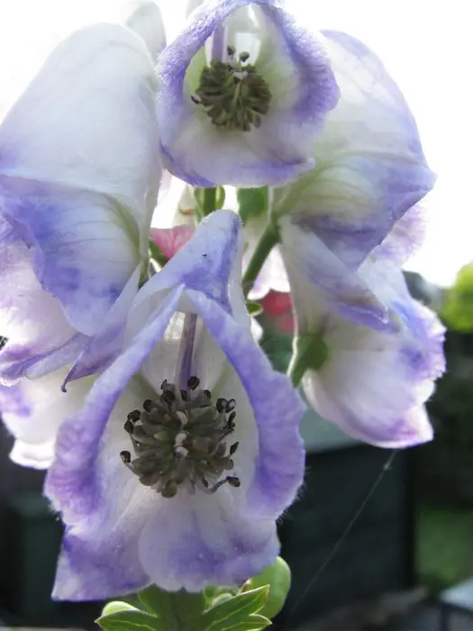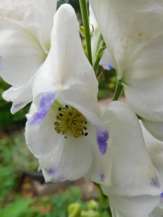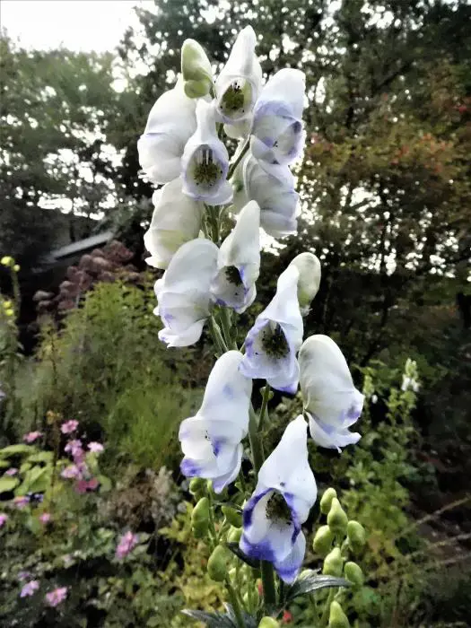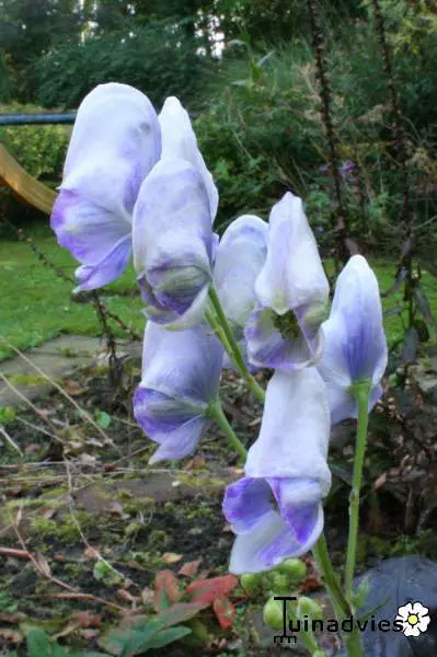 Bloeit op stevige stengels met grote aren van blauwpaars gerande, witte helmvormige bloemen.