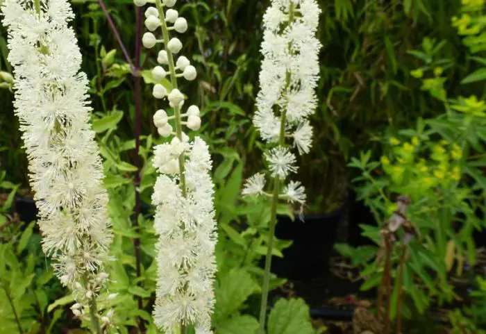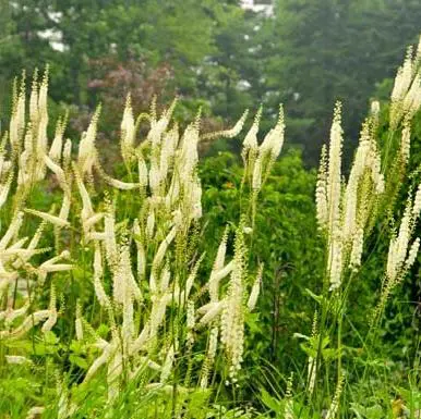 Actaea racemosa is een vaste bosplant uit Noord-Amerika met frisgroene geveerde bladeren en lange vertakte stengels waaraan roomwitte geurige bloemaren bloeien.