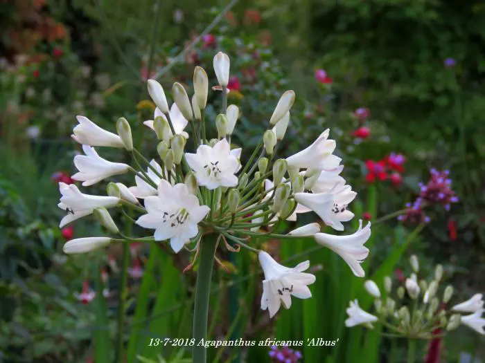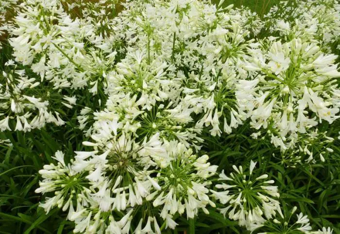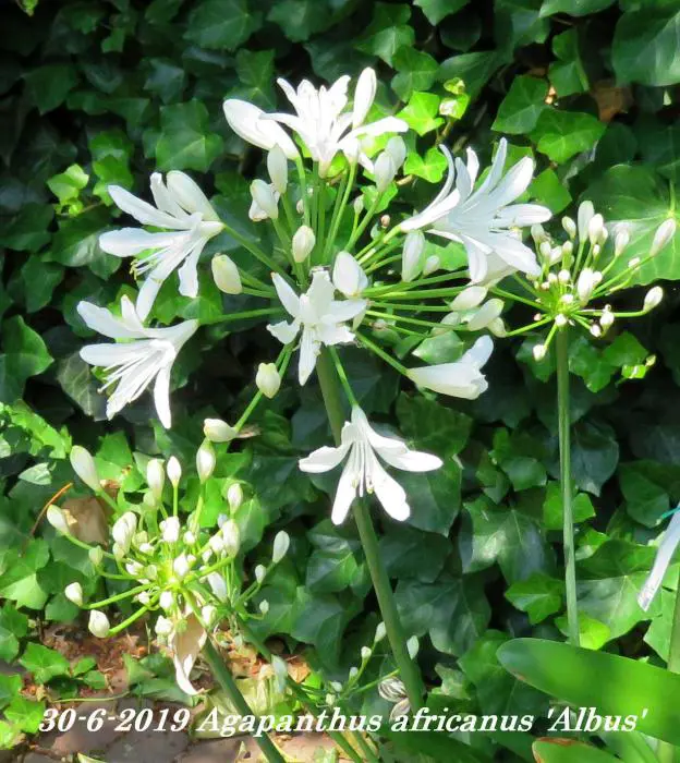 Agapanthus africanus 'Albus' heeft groene riemvormige bladeren en grote witte bloemen die lijken te zweven op lange, slanke stevige stengels boven de bladeren.