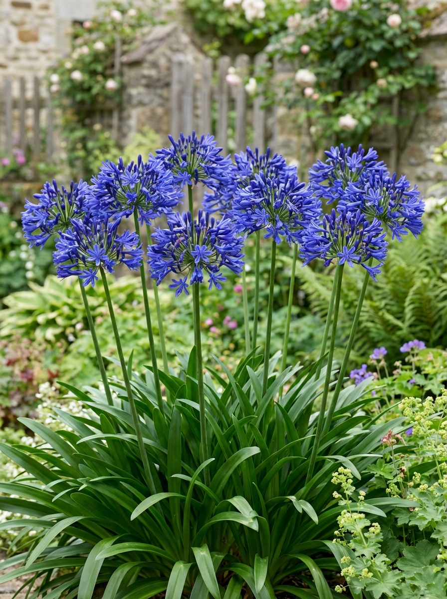 Agapanthus 'Blue Giant' heeft riemvormige bladeren en bloeit rijkelijk met grote, ronde schermen van blauwe trompetvormige bloemen op stevige stengels.