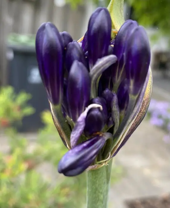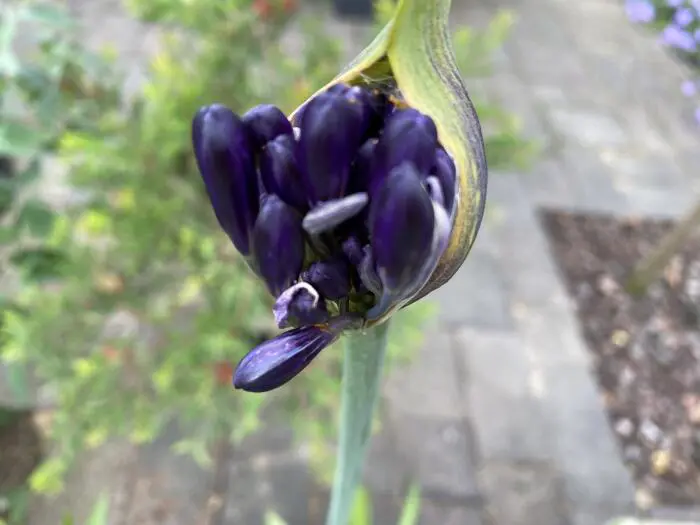 Agapanthus 'Blue Moon' heeft riemvormige bladeren en bloeit rijkelijk met ronde schermen van lichtblauwe tot grijswitte trompetvormige bloemen met een donkerder hoofdnerf.